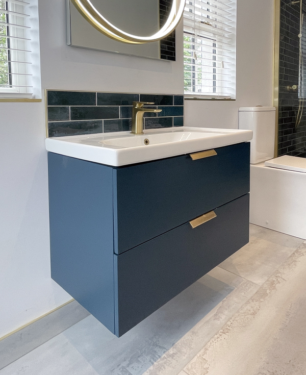 At the centre of the space is the Stockholm Ocean Blue Vanity Unit from Sonas Bathrooms, which immediately draws attention. The deep blue finish adds contrast against the lighter floor tiles and walls, helping to define the vanity area clearly.