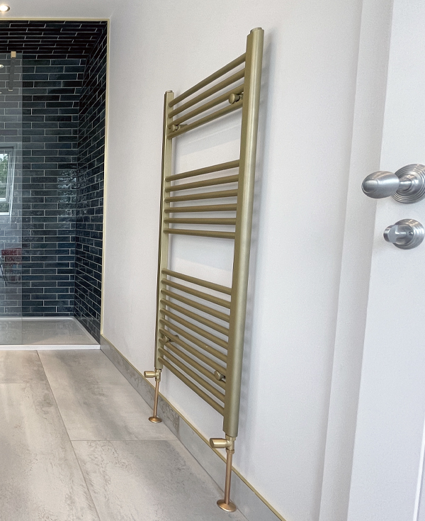 The Aura Brushed Brass Exposed Shower Kit and Ara Brushed Brass Towel Rail introduce warmth and contrast against the darker shower area and neutral flooring. Rather than mixing finishes, sticking with brushed brass across key elements keeps the design consistent and well-balanced.