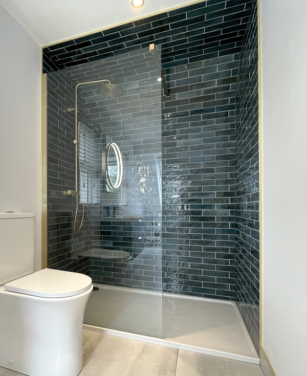 The Aspect Gold Shower Screen complements the brass fittings, keeping the finishes aligned while maintaining a clean, open feel. The frameless style allows light to pass through the space, preventing the darker tiles from feeling enclosed.