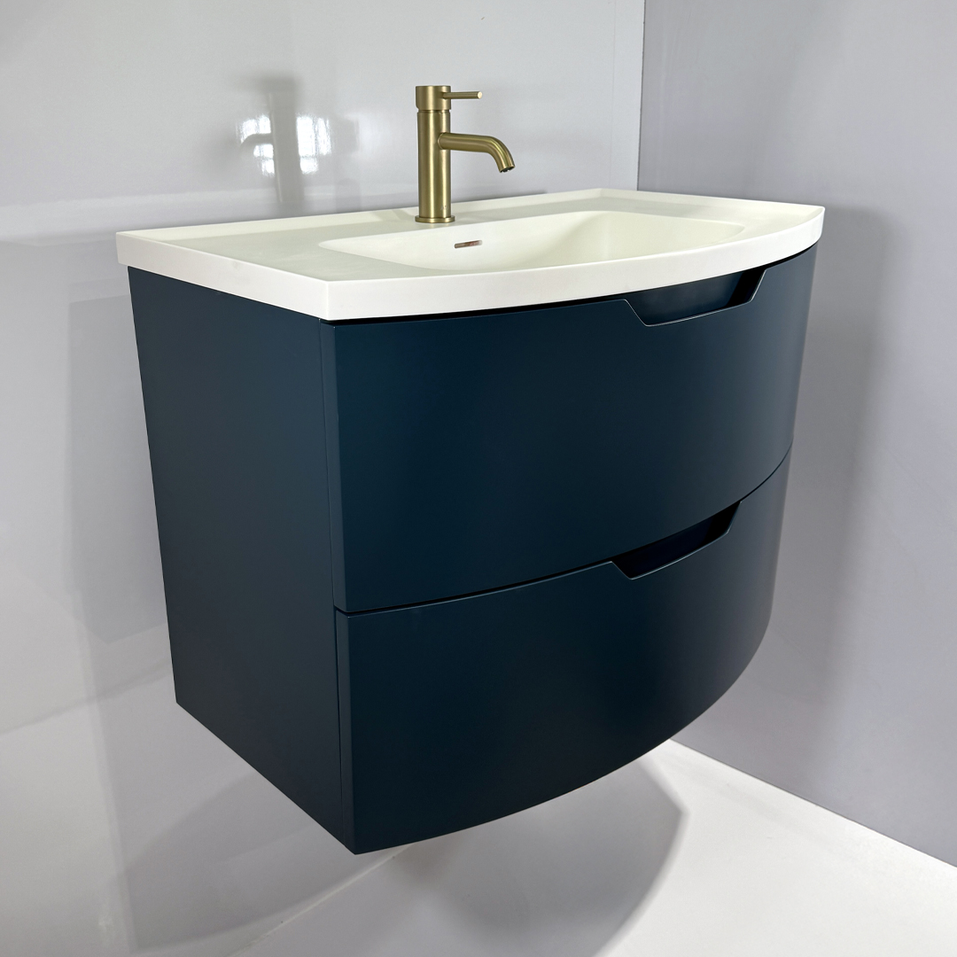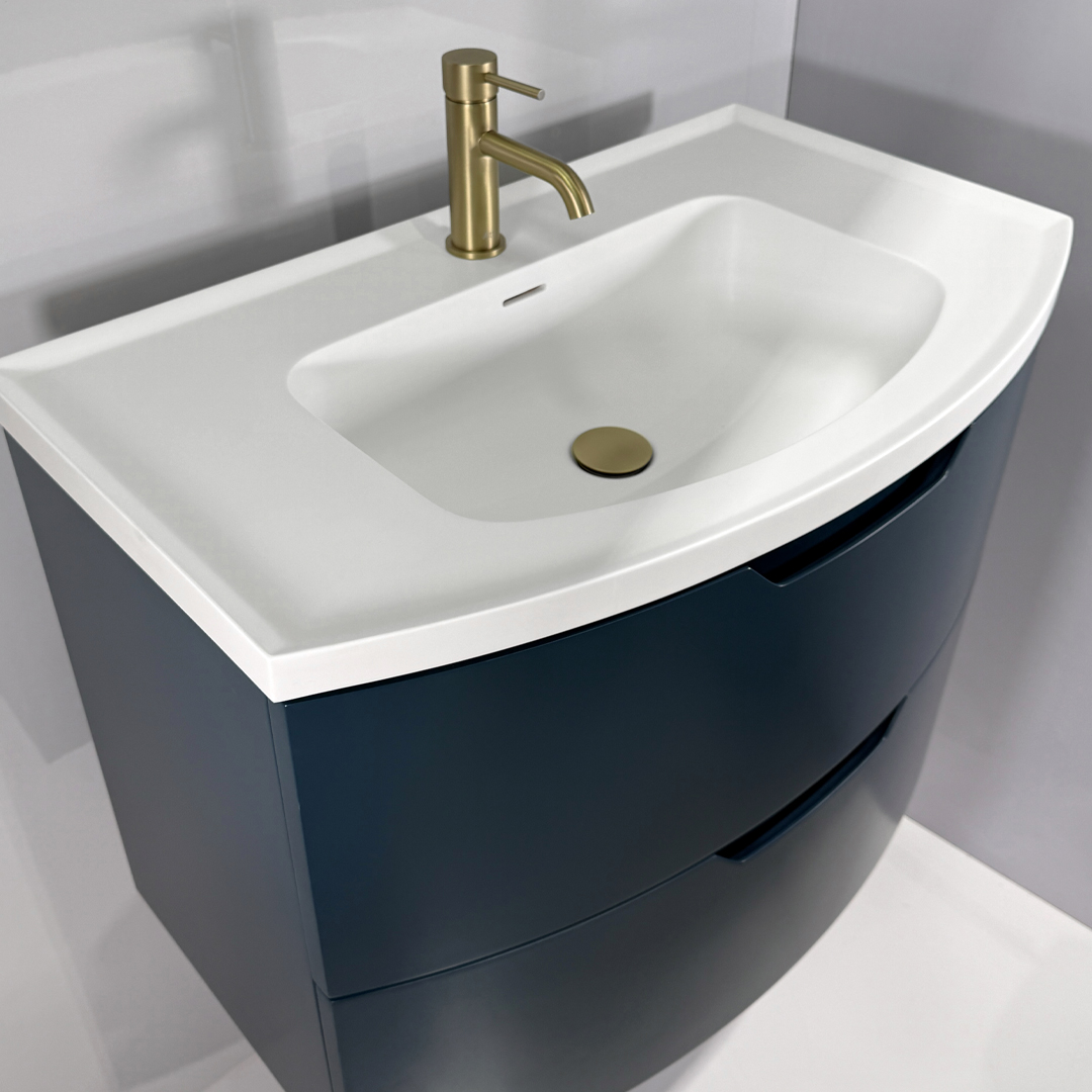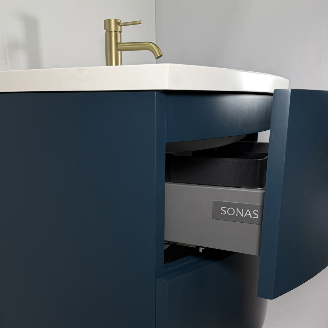 The Arc 800mm wall hung vanity unit in Ocean Blue features soft curved lines, handleless drawers, and an integrated matt basin. A statement piece from the Sonas Scandinavian range, designed for modern bathrooms. Tap not included.
