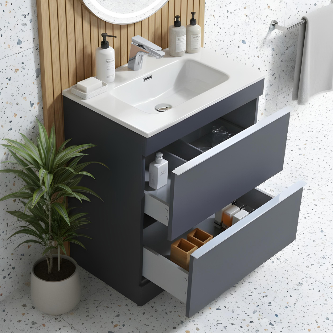 This premium vanity unit presents a highly desirable look that will complement on-trend, designer bathrooms. There is plenty of storage space for all your bathroom essentials, thanks to the 2, each with stylish chrome handles & soft close runners to help reduce noise.