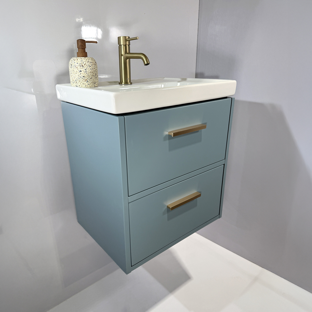 Featuring two soft-close, in-frame drawers with durable metal box runners, the unit provides practical storage while maintaining a clean, refined appearance. The integrated basin is included, creating a seamless, countertop-style finish that enhances the overall look of the unit. Its short projection design makes it ideal for smaller bathrooms, en-suites, or cloakrooms where space is at a premium.