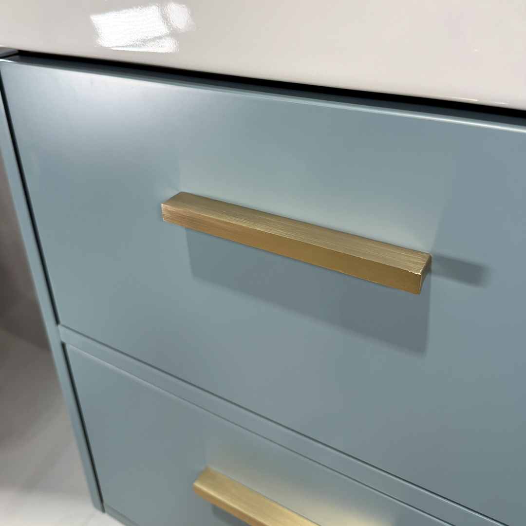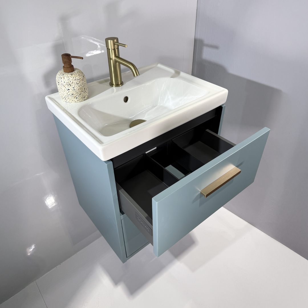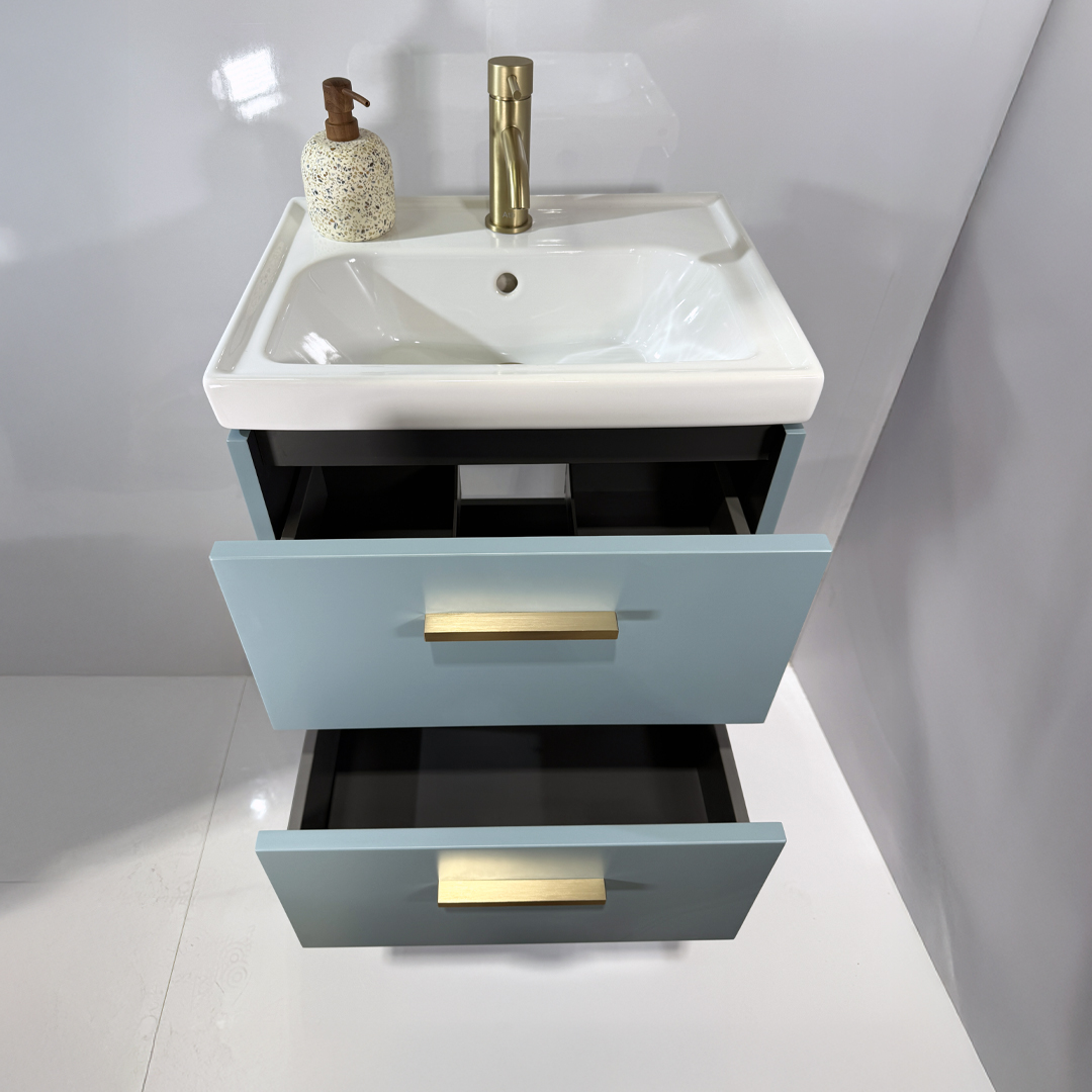 This Sonas Scandinavian Range wall-hung vanity unit is a striking piece of bathroom furniture designed to be the focal point of your space. Finished in the elegant Morning Sky Blue with contrasting gold handles, this 500mm unit offers a perfect balance of colour, texture, and contemporary Scandinavian design.