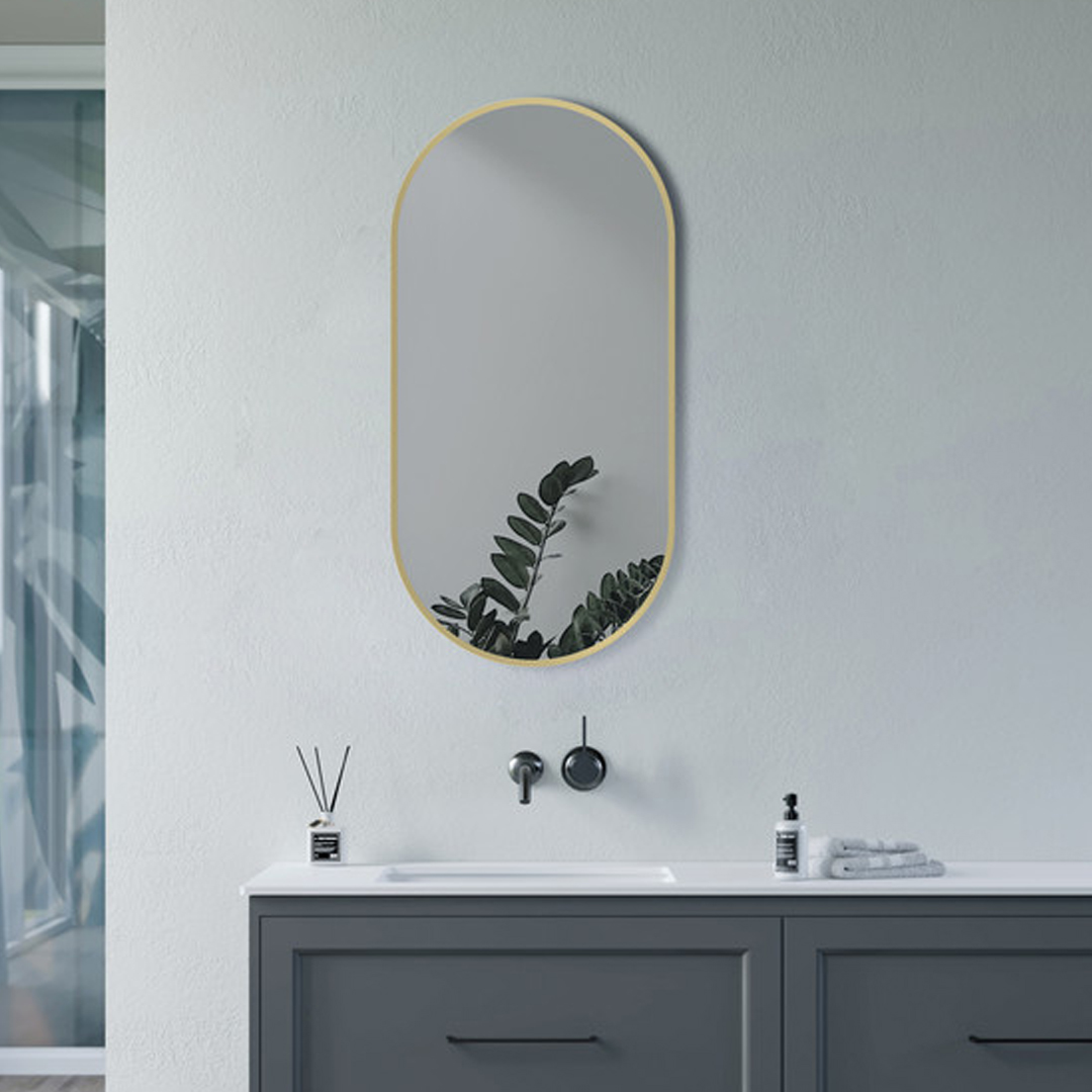 The Kenji 800x400mm Oblong Mirror brings a sleek, modern touch to any bathroom or living space. Its brushed brass–coated aluminium frame adds a warm, contemporary finish, enhancing the mirror’s elegant oblong shape. Slim at just 20mm deep, it fits seamlessly into both minimalist and stylish interiors.
