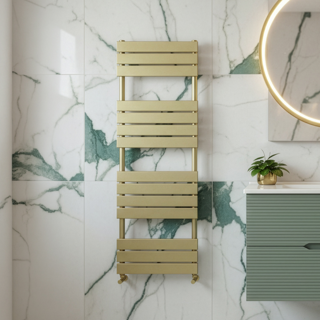 The Oro heated towel rail, a timeless classic design & a great addition to our heating selection. This attractive towel rail is made of sturdy steel and has a contemporary, eye-catching brushed brass finish. It has a fantastic heat output that will efficiently warm towels and your bathroom or ensuite.
