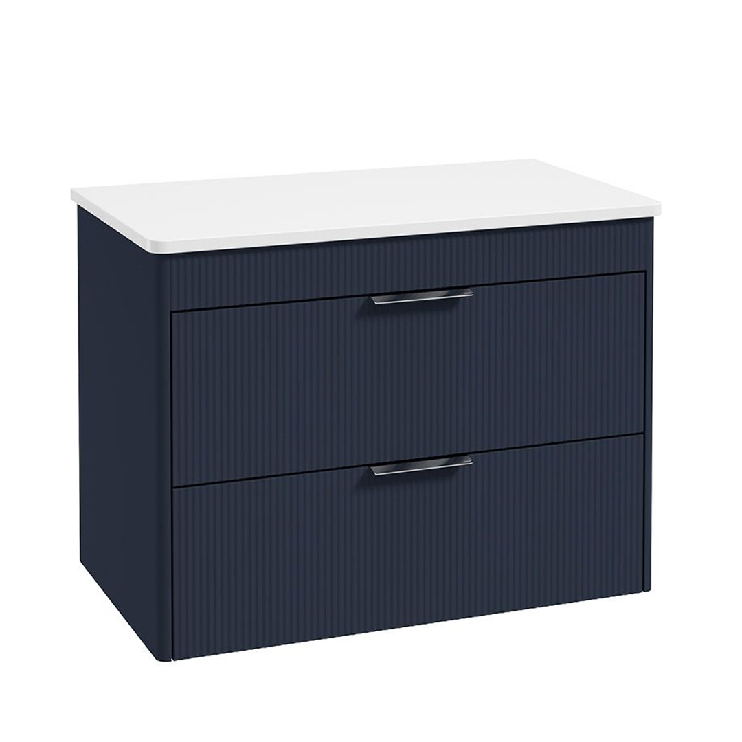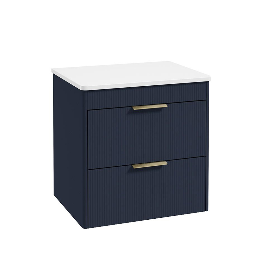The REED Wall Hung Two Drawer Countertop Vanity Unit in Cobalt Night is a stylish and functional choice for contemporary bathrooms, combining elegant design with everyday practicality. Finished in a rich matt Ruby Fern, this vanity unit features a distinctive fluted front design that adds texture and visual interest to modern interiors.