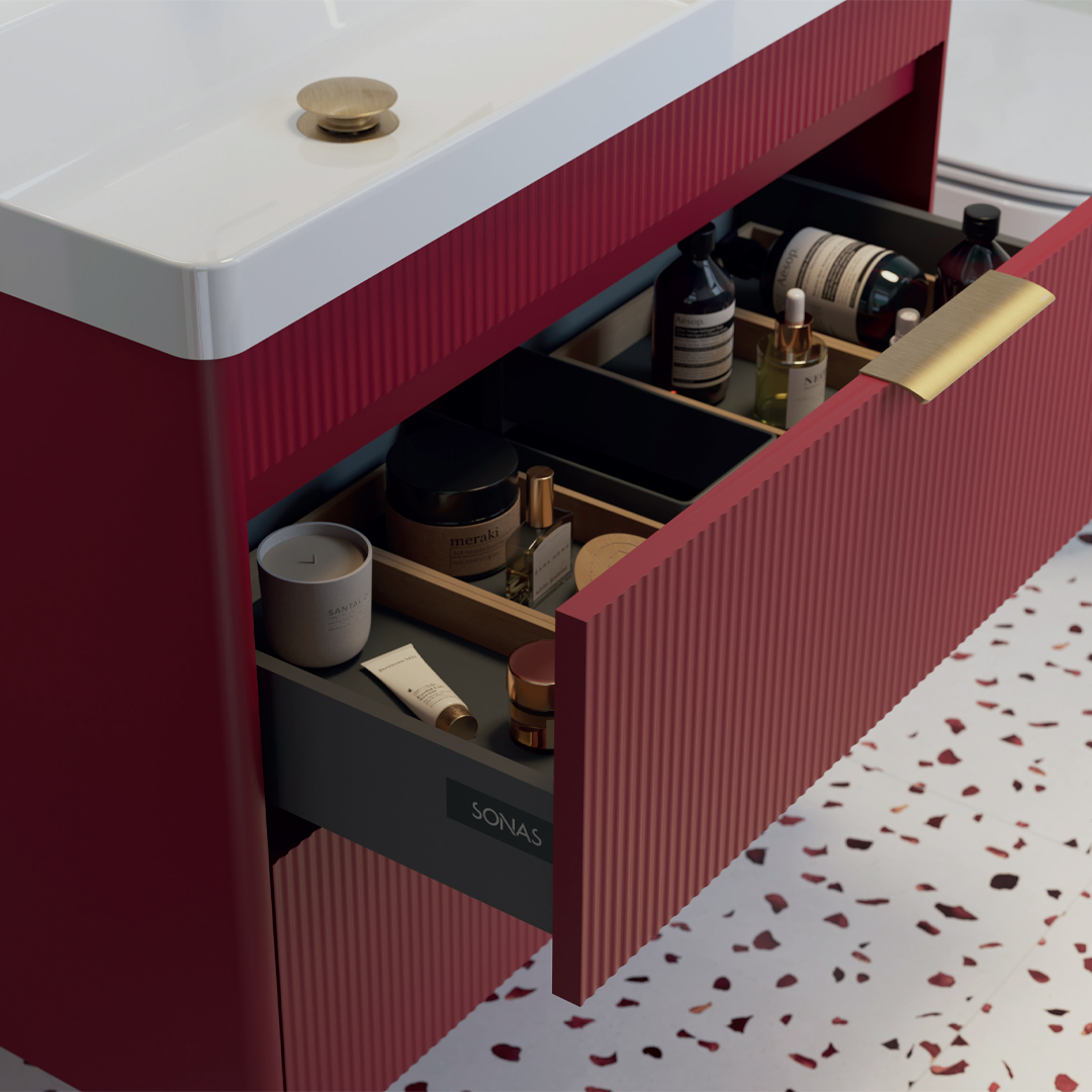 The SONAS REED Vanity features a contemporary fluted design, gloss resin basin, and soft-close drawers for smooth, modern functionality.