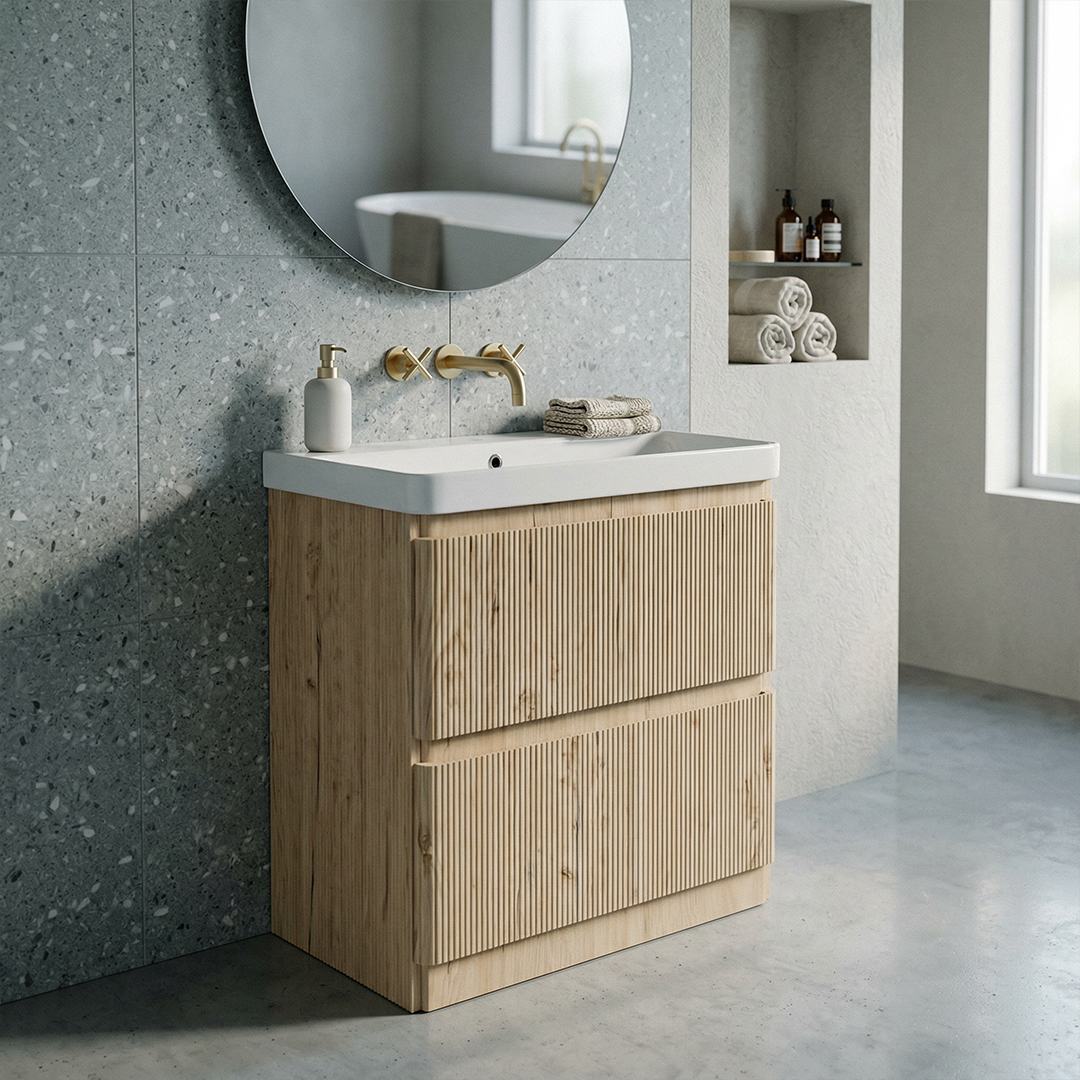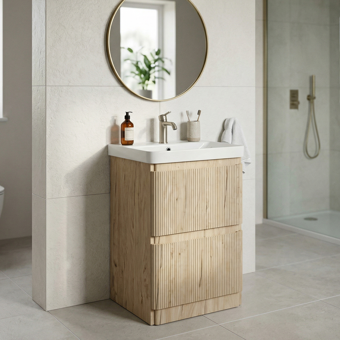 The Ridge Textured Oak Floorstanding Vanity Unit brings natural warmth and contemporary style to your bathroom. Designed with soft curves and a realistic textured oak finish, this floorstanding vanity unit creates a softer, more organic feel while maintaining a clean modern aesthetic.