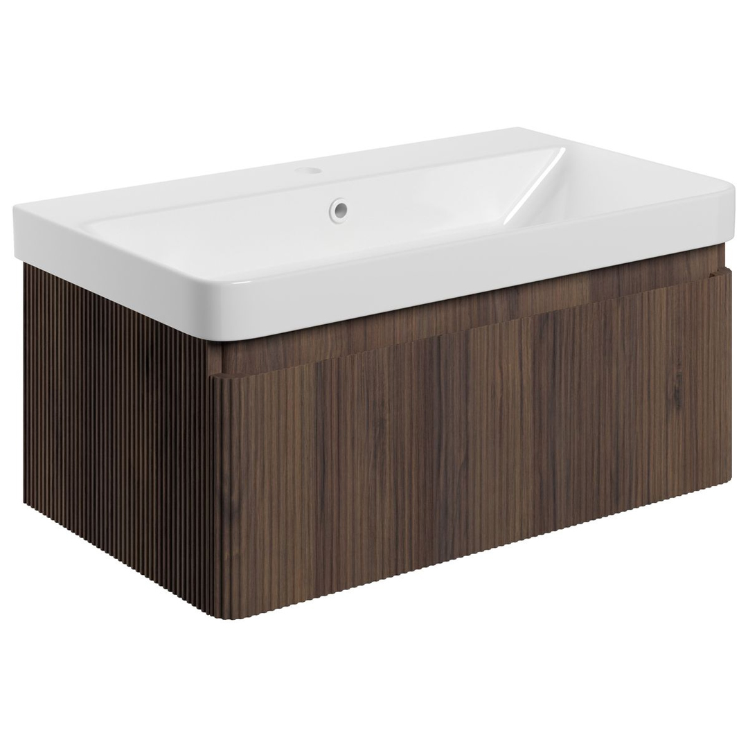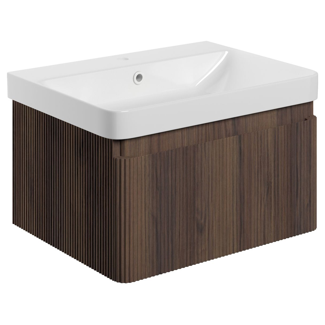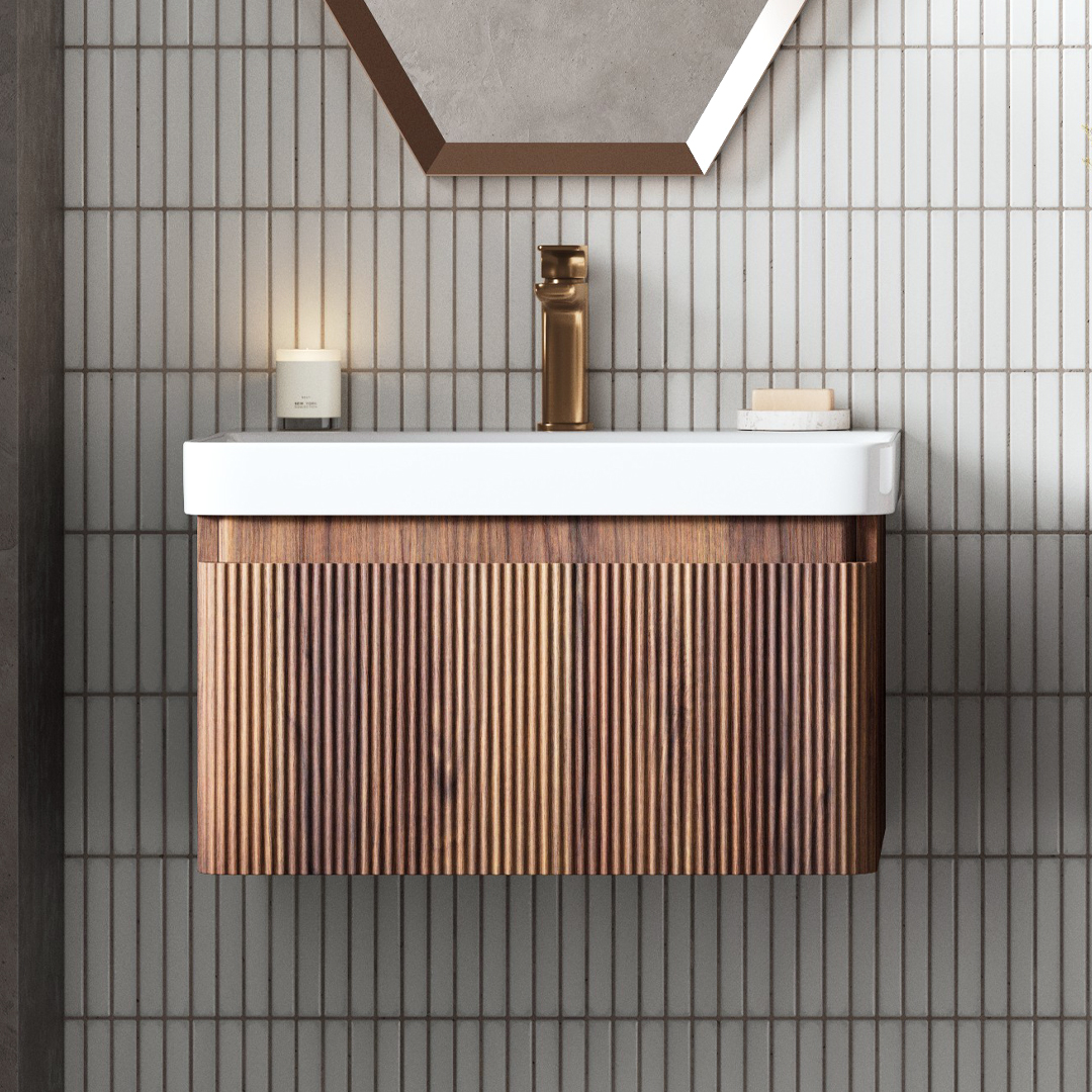 Beautifully crafted with a focus on texture, tone, and practicality, this wall-hung vanity is designed to make a statement. The fluted walnut-effect finish evokes the warmth and character of real wood, adding depth and contrast to modern interiors.