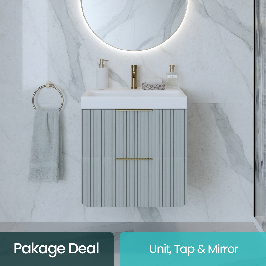 The centrepiece of this bundle is the Sorrento Doller Green Fluted Wall Hung Vanity & Basin, combining contemporary fluted detailing with a deep green finish for a standout statement. Paired with the Hyde Brushed Brass Basin Mixer Tap, the result is a beautiful contrast of texture and tone — stylish, timeless and built to last. Completing the package is the Asti Round Brushed Brass LED Mirror, offering ambient backlighting and a sleek minimalist silhouette for the perfect finishing touch.