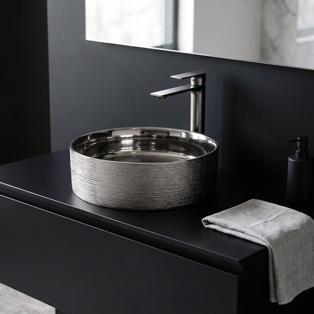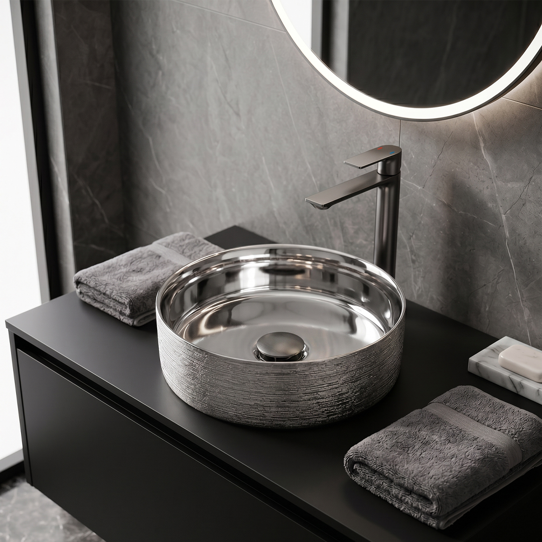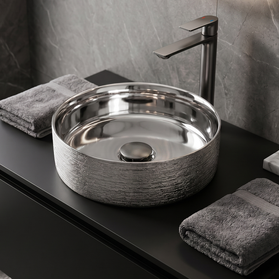 The Sterling Basin is designed to bring a strong visual feature to any bathroom space. With its textured silver exterior and polished inner surface, it offers a balanced combination of detail and simplicity, making it suitable for both modern and more refined interiors.
