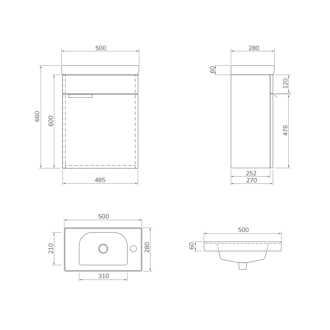 • 50cm wall hung design, cloakroom unit with 1 soft close door and handle. W500 x D280mm