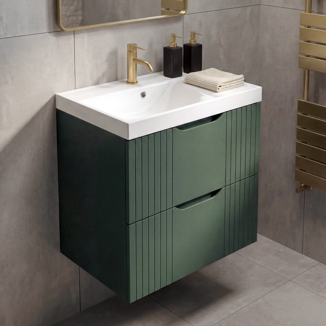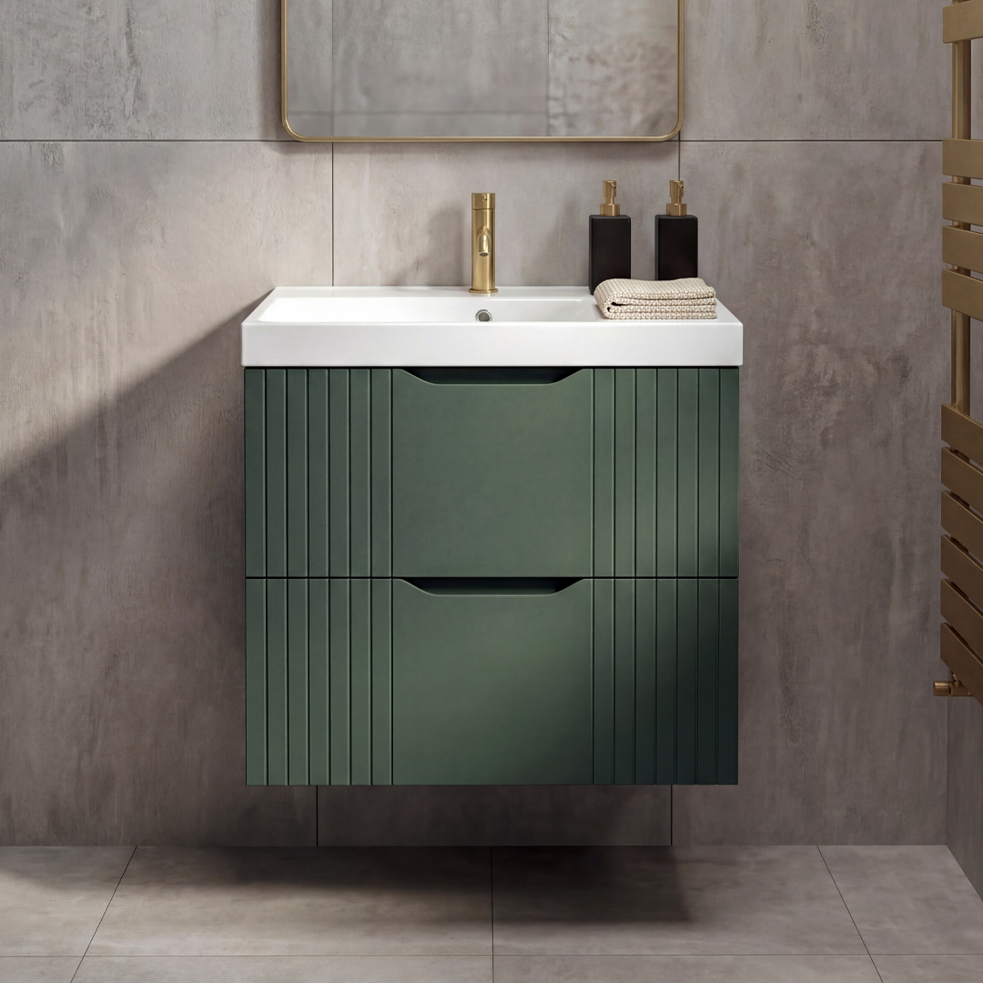 Defined by its vertical detailing along the sides and drawer fronts, the unit adds subtle texture without overcomplicating the overall design. Its wall-hung installation keeps the floor area clear, helping the room feel more open and easier to maintain — particularly useful in smaller or more compact spaces.