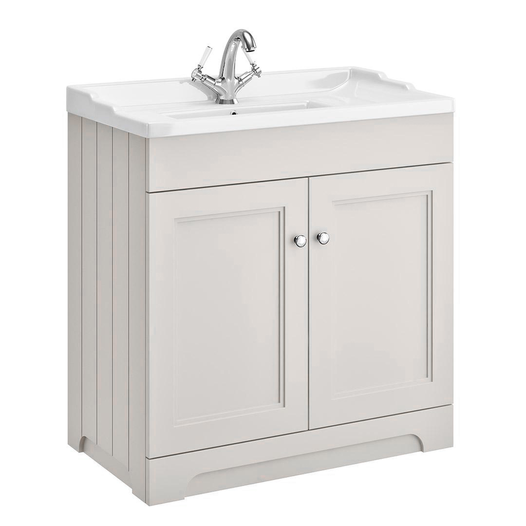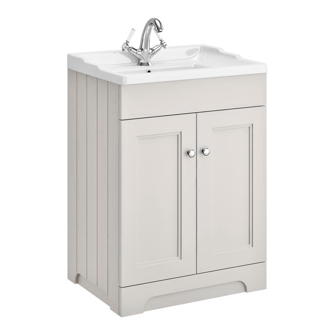 A classic two-door floorstanding vanity unit in a soft dove grey matt finish, complete with chrome round knobs. Available in 600mm and 800mm sizes.