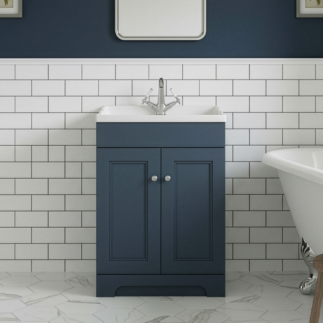 A traditional two-door floorstanding vanity unit in a rich Midnight Blue matt finish, complete with chrome round knobs. Available in 600mm and 800mm sizes.
